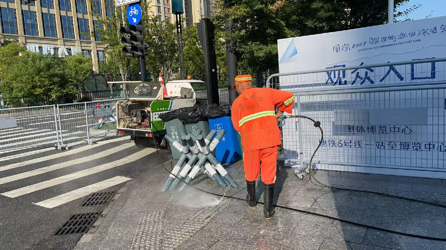 當(dāng)演出落幕、人潮散去,留給這座城市的是一個(gè)被雨水與人群雙重“考驗(yàn)”過的現(xiàn)場(chǎng)。然而第二天清晨,“大蓮花”及周邊區(qū)域已然恢復(fù)整潔如初。這背后,是一場(chǎng)嚴(yán)密部署、高效執(zhí)行的環(huán)境衛(wèi)生保障行動(dòng)。提前部署,應(yīng)對(duì)降雨挑戰(zhàn)。針對(duì)演唱會(huì)期間降雨給環(huán)衛(wèi)工作帶來的額外壓力,濱江區(qū)綜合行政執(zhí)法局提前成立工作專班,制定了詳細(xì)的垃圾清運(yùn)預(yù)案,將責(zé)任落實(shí)到每個(gè)人。前期在做好常態(tài)化保潔的同時(shí),加大對(duì)活動(dòng)現(xiàn)場(chǎng)及周邊區(qū)域的保障力度,通過“人機(jī)結(jié)合、多車聯(lián)合、地毯式保潔”模式,為市民營(yíng)造干凈整潔的市容環(huán)境。